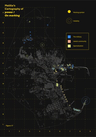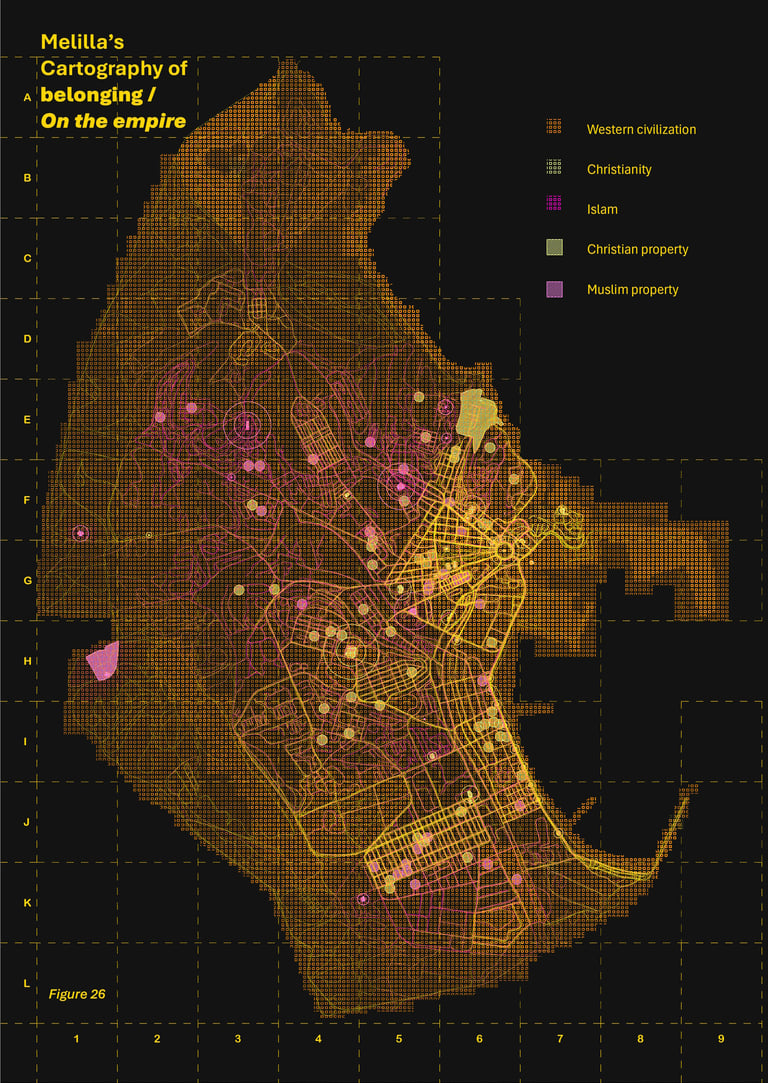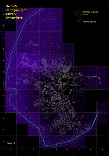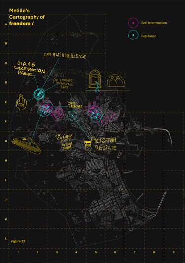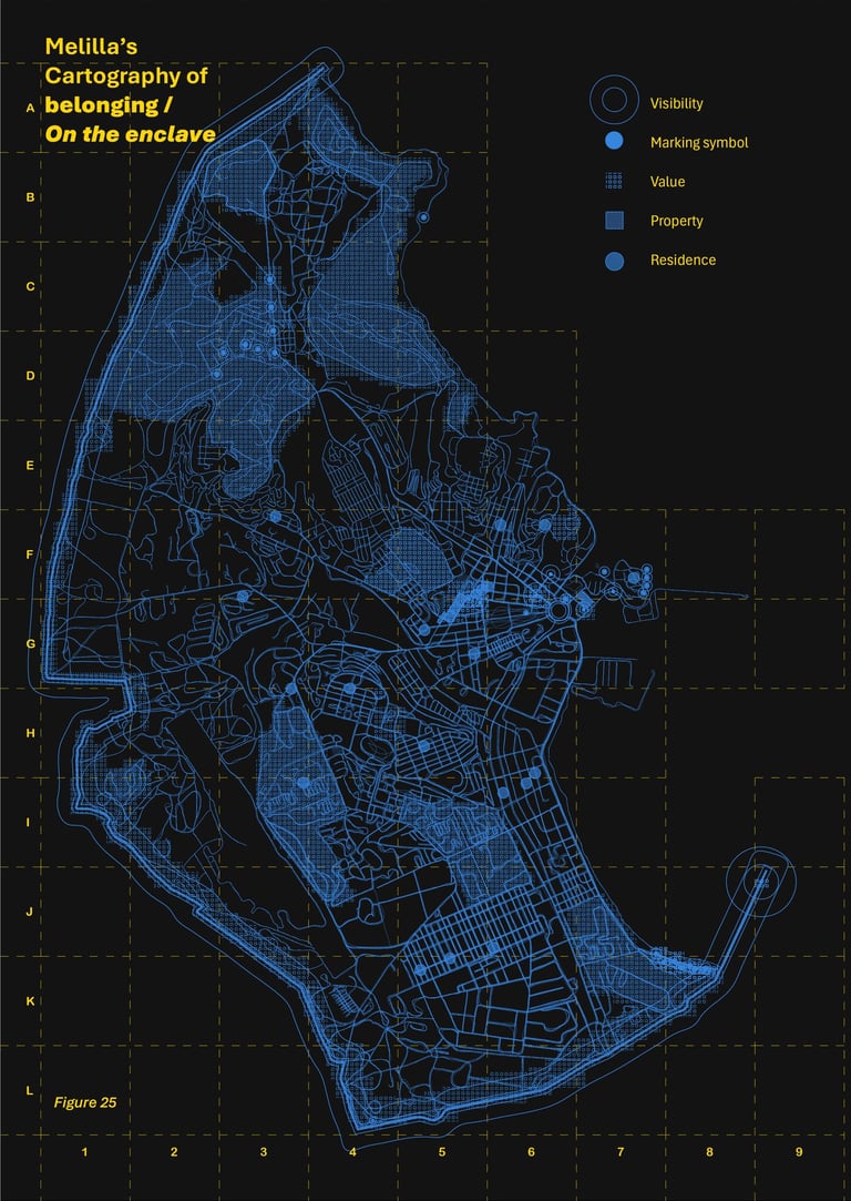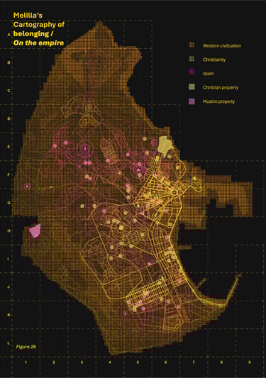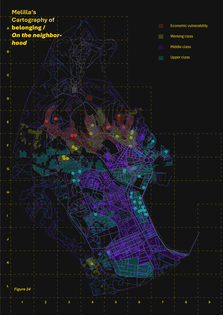 This thesis examines the concept of belonging in Melilla through a framework that integrates the distribution of power structures within this North African enclave, whose sovereignty remains contested. The enclave’s history as a colonial outpost during the 1920s and 1930s has contributed to its extensive militarization, which coexists with an emerging narrative of "multiculturalism" intended to characterize the city. By employing a series of cartographies and diagrams, the study analyzes various groups of belonging and explores their underlying power dynamics from a psychoanalytical perspective.