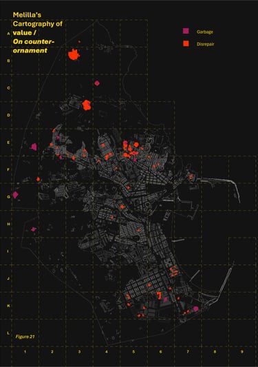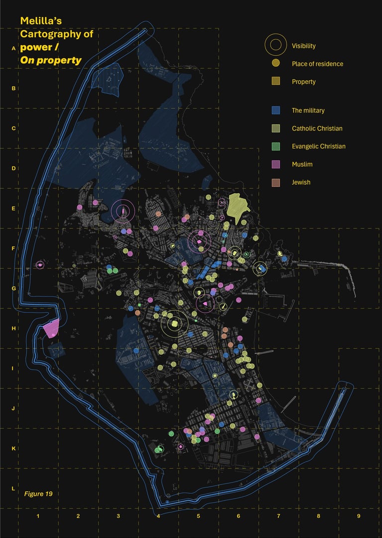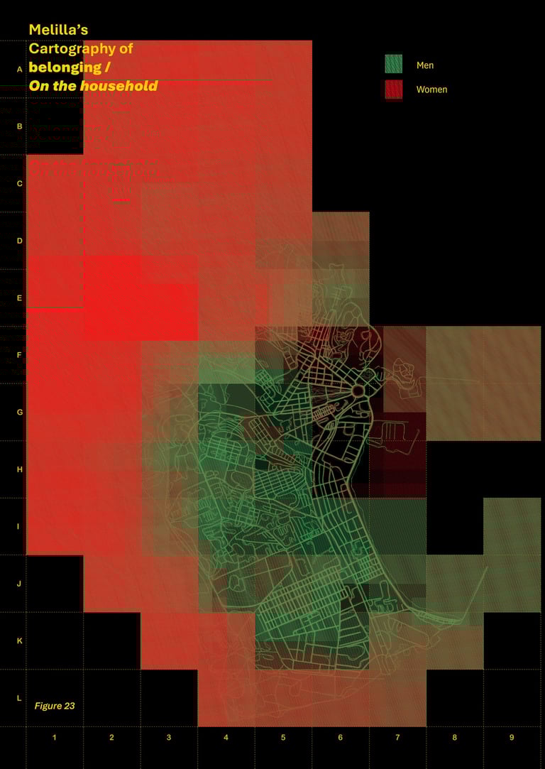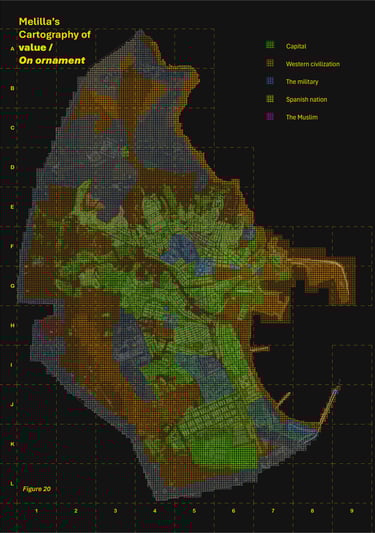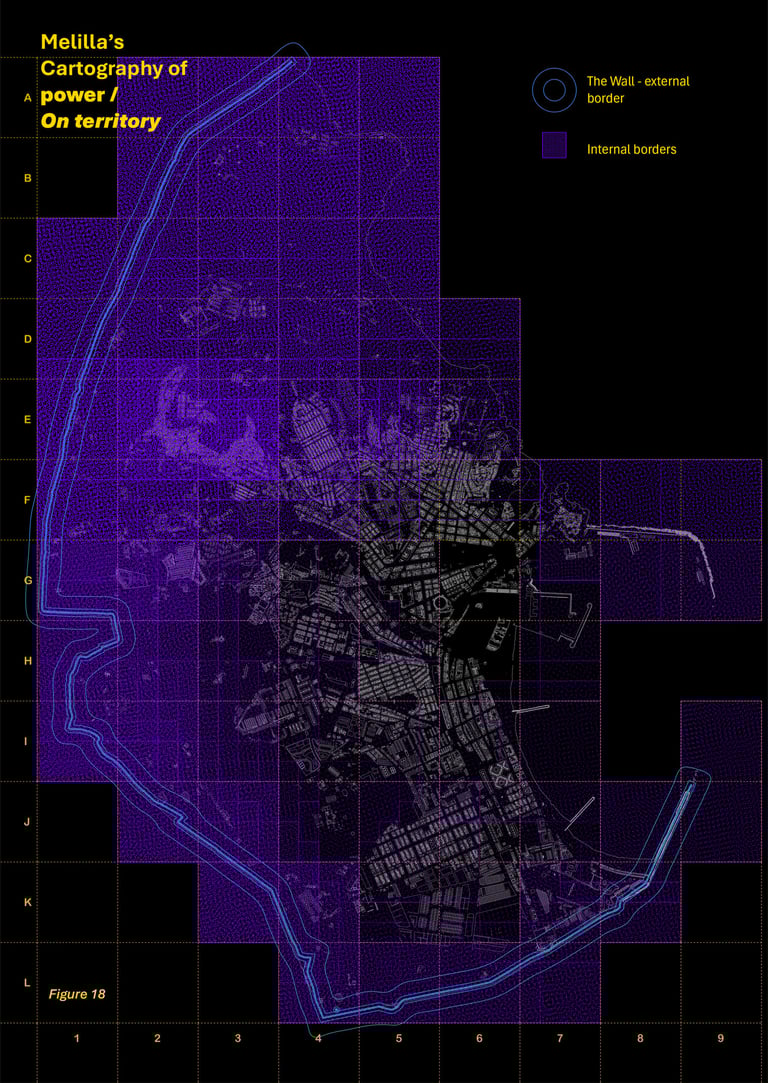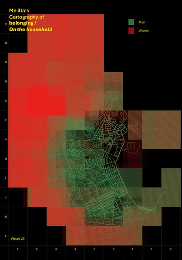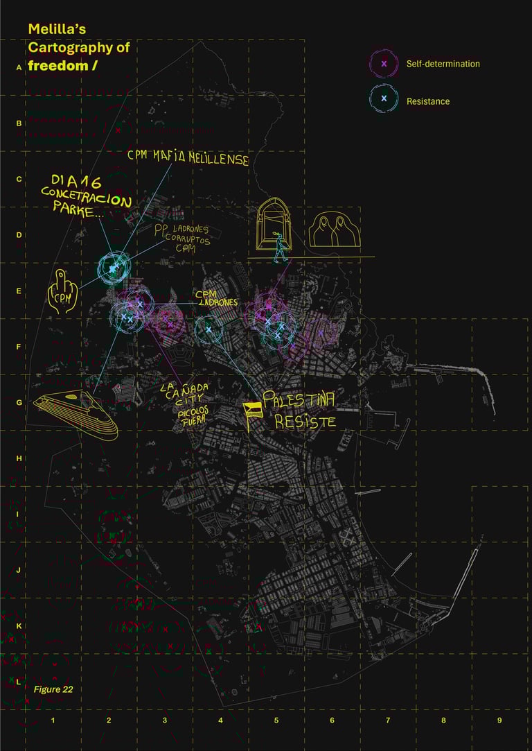 This thesis examines the concept of belonging in Melilla through a framework that integrates the distribution of power structures within this North African enclave, whose sovereignty remains contested. The enclave’s history as a colonial outpost during the 1920s and 1930s has contributed to its extensive militarization, which coexists with an emerging narrative of "multiculturalism" intended to characterize the city. By employing a series of cartographies and diagrams, the study analyzes various groups of belonging and explores their underlying power dynamics from a psychoanalytical perspective.