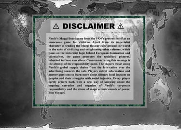 Taking the 1930 Maggi board game as a reference, our project proposes a counter-cartography to the map illustrated on the board and counter-dynamics to those established in the game by the Maggi company. As a final product, we designed a video game that intends to point out, in a didactic and ludic way, Maggi's lack of social and environmental responsibility throughout the world. Likewise, as it is a video game, it’s designed to be disseminated in order to amplify the counter-narratives that question the colonial and exploitative discourses exposed by the company. This purpose is achieved through the map itself and through disclosures of data, present in the video game, that tie together the different capitalistic and colonial corporative techniques that Maggi follows in the present throughout the world.