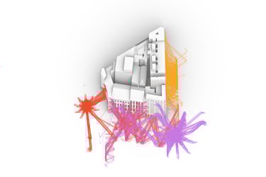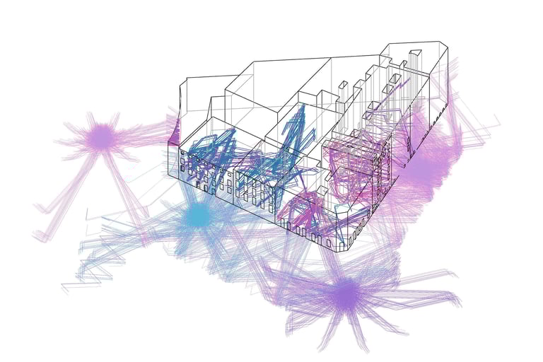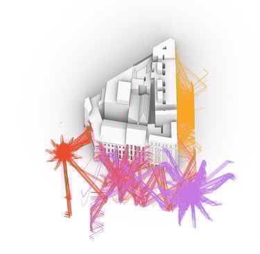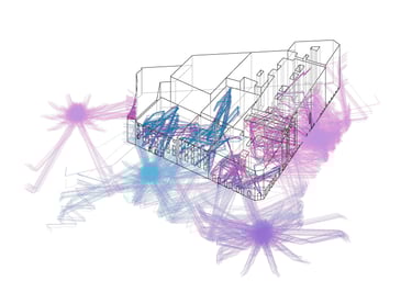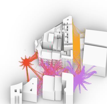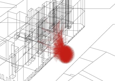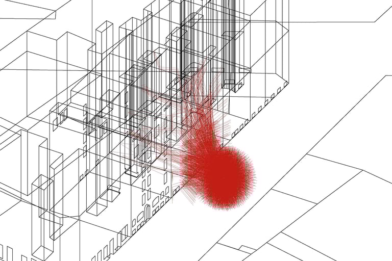 To create a realistic simulation, sound sources are positioned at road level, aligned with vehicle height. Acoustic rays, representing sound waves, are either blocked or redirected upon striking building façades. Additionally, rays that intersect façade openings are extended within the visualization to assess their impact on interior spaces.